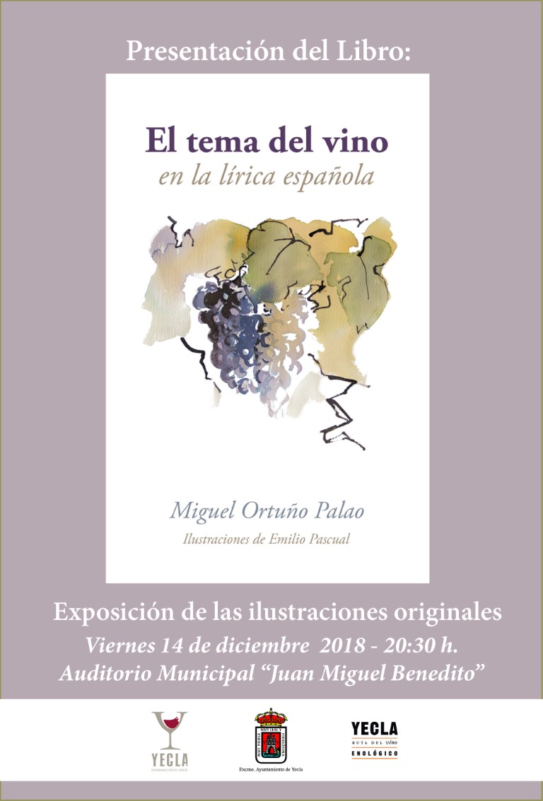 Miguel Ortuño Palao, Catedrático de Instituto, Cronista Oficial, Medalla de Oro de Yecla, Académico numerario de la Real Academia Alfonso X el Sabio, autor de numerosos libros sobre nuestra ciudad ha creado esta obra que, por plena liberalidad, ha ofrecido al Ayuntamiento de Yecla, a la Denominación de Origen y a la Asociación Ruta del Vino de Yecla para que sirva de herramienta cultural para los ciudadanos y los enoturistas que pueden acceder a las poesías más inspiradas, desde Berceo a nuestros días, sobre la temática de este “néctar divino”. Dedica un apartado especial a los poetas de Murcia y de Yecla. Termina con una miscelánea sobre el vino en la Biblia, el folclore y el refranero popular, así como una etimología de vocablos relacionados con el vino.