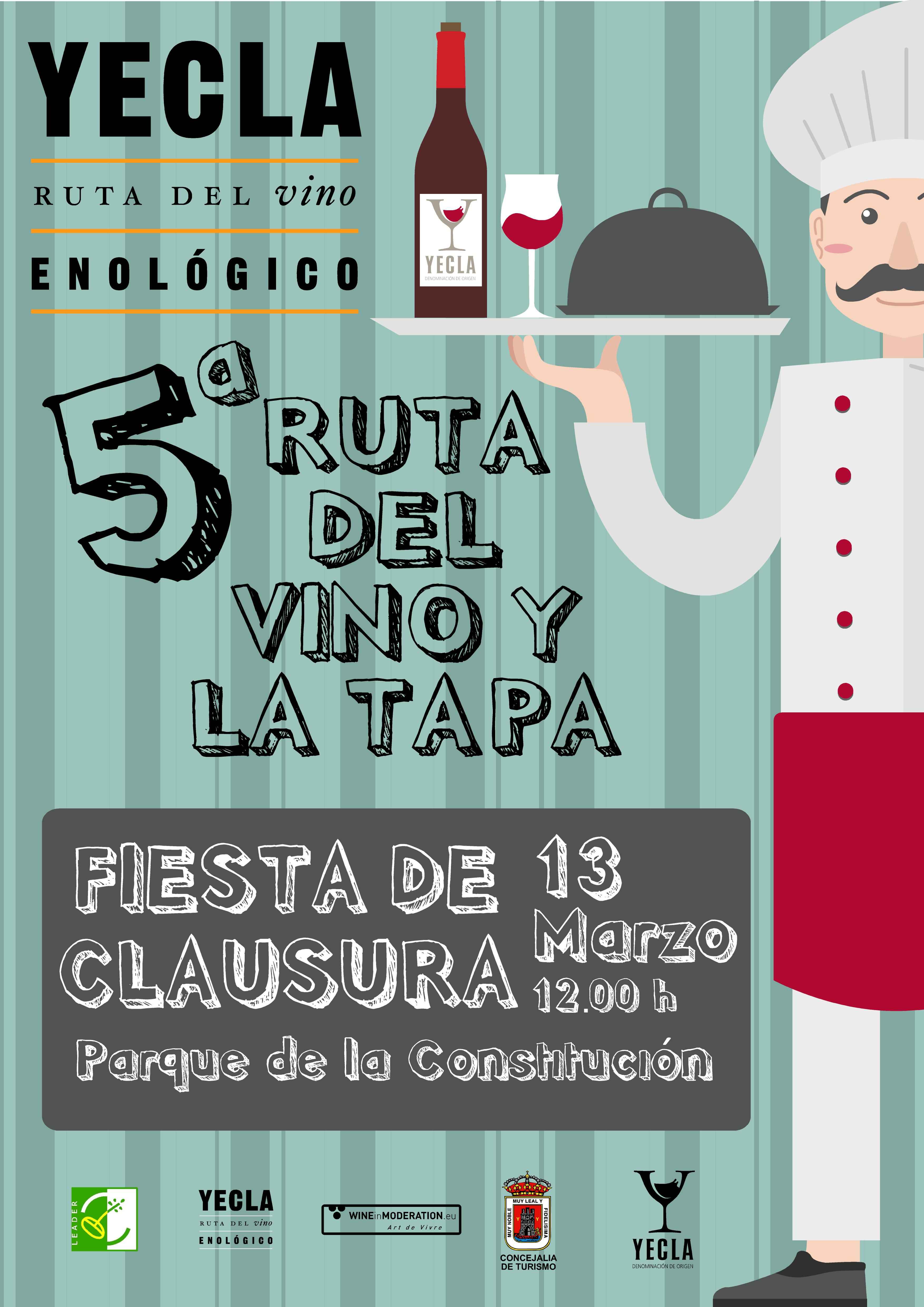 Con motivo de la clausura de la 5ª Ruta del Vino y la Tapa, el próximo domingo 13 de Marzo, la Asociación Ruta del Vino de Yecla, con la colaboración del CRDO Vinos de Yecla y del Excmo. Ayuntamiento, hemos organizado una "Fiesta Gastronómica" , en la que se entregará la BARRICA DE ORO 2016 al establecimiento popularmente más votado por todos los "Ruteros" que hayan cumplimentado el recorrido en su totalidad, y por tanto, hayan depositado su cartilla debidamente sellada. Además, este año se entregarán 3 menciones especiales, a los establecimientos cuyas tapas hayan quedado en segundo y tercer lugar, y una distinción especial al establecimiento seleccionado por su mejor trato y servicio al vino.